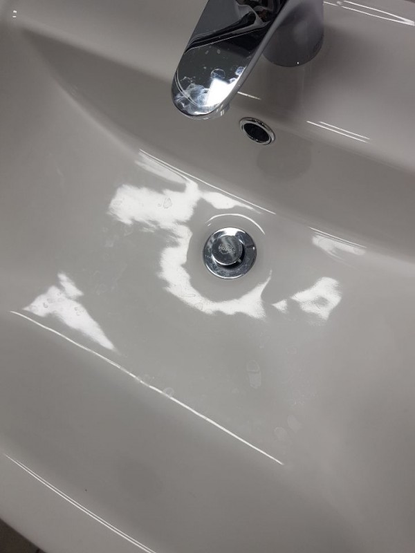 다음은 세면대 입니다~ 세면대 역시 수전과 마찬가지로 잦은 물사용에 각종 클렌징제품들의 사용으로 쉽게 지저분해지는 곳이지요~ 시공 전 세면대 입니다. 보통 세면대에서 물을 사용하게 되면 물이 퍼지면서 세면대 표면에 흡수되기 마련인데 코팅 후에는 물이 표면에 거의 붙지 않고 깔끔하게 흘러내려가기 때문에 사진처럼 깨끗하게 사용하실 수 있습니다.