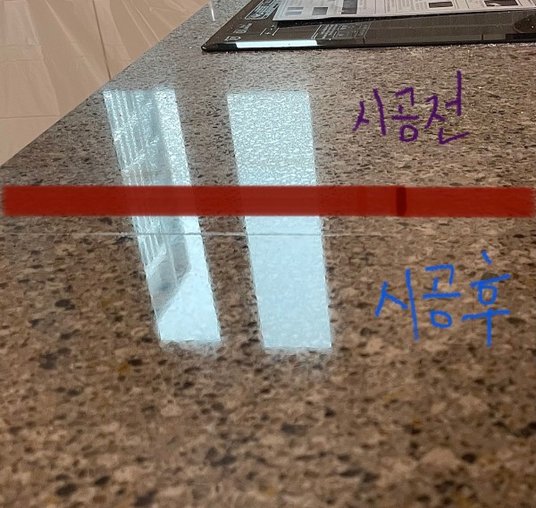 먼저 보여드릴 사진은 상판 연마 전과 후 모습인데요~ 시공 전과 후 가장 큰 차이는 아무래도 광택의 유무라고 할 수 있습니다..