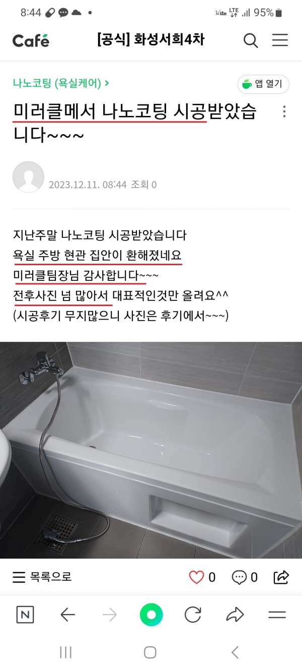 고객후기 | 미러클 나노코팅 실제고객후기(화성서희4차)
