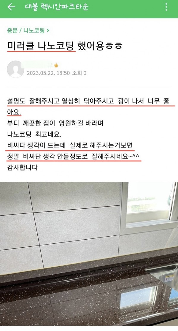 고객후기 | 미러클 나노코팅 실제고객후기(대불렉시안파크타운)