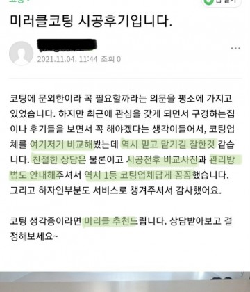 미러클 나노코팅 실제 고객 후기 ( 힐스테이트 호암 )